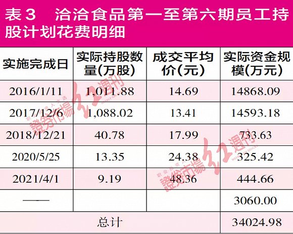 需要注意的是,据洽洽食品2016年1月12日发布的《关于员工持股计划完成购买的公告》显示,该资产管理计划共花费了14868.09万元,是目前洽洽食品员工持股计划花费最多的一次。但《红周刊》记者进一步梳理发现,洽洽食品第二期至第六期员工持股计划的花费同样不俗,累计将达19156.89万元左右。据此测算,自2015年至今,洽洽食品在员工持股计划的花费将达3.40亿元(见表3),而这一数据已占恰恰食品去年全年净利润的42.24%。