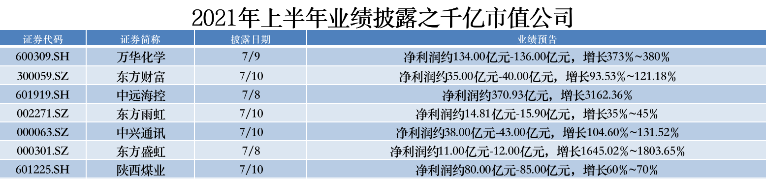 本周共有7家市值超过千亿元的公司披露业绩预告,分别为万华化学(600309.SH)、东方财富(300059.SZ)、中远海控、东方雨虹(002271.SZ)、中兴通讯(000063.SZ)、东方盛虹、陕西煤业(601225.SH)。