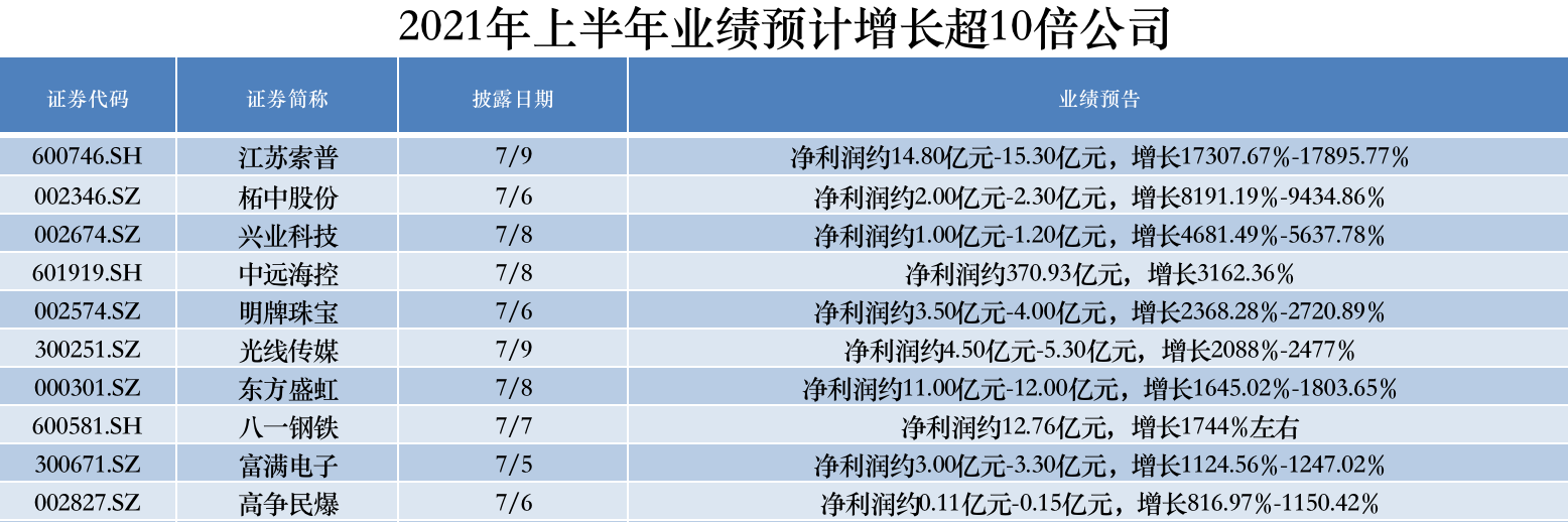 在预增公司中,以净利预增上限统计,有105家公司预增翻倍,其中,10家公司业绩增长超过10倍。