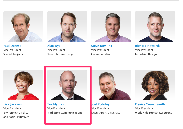 上周末,苹果在官网正式上线了新一任营销传播副总裁Tor Myhren的个人介绍。去年12月,苹果公司把这位业内大咖从广告公司Grey那里挖了过来。他曾经担任Grey纽约的总裁和全球首席创意官。