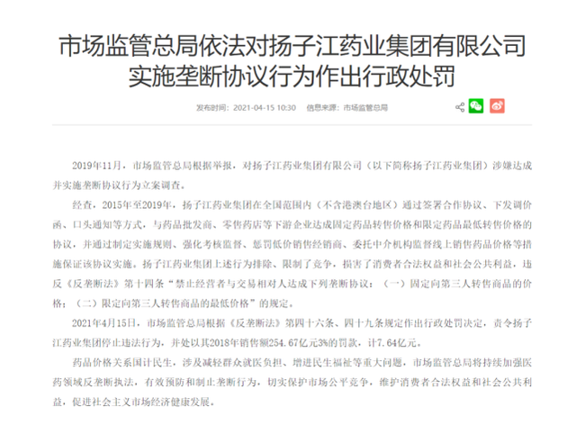 据此,市场监管总局根据《反垄断法》第四十六条、四十九条规定作出行政处罚决定,责令扬子江药业集团停止违法行为,并处以其2018年销售额254.67亿元3%的罚款,计7.64亿元。