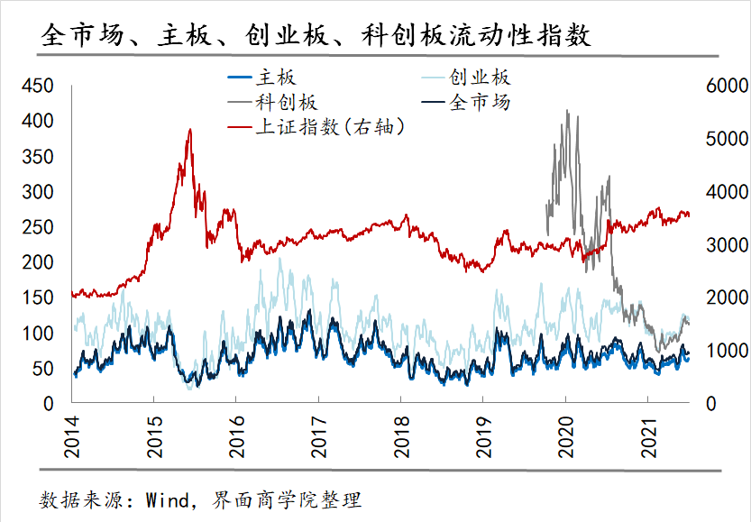 由于政策信号、行业趋势、公司业绩和资金流向等最终都反映在成交上,最后一个层面的流动性也是最不会说谎的流动性,为此,界面商学院以价量结合的方式测算了个股、板块及指数的流动性,并将其作为先行指标预测市场走势。