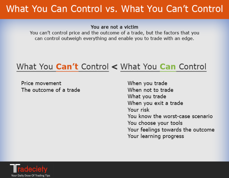 看上图,90%的交易者独独关注左边,即他们无法控制的因素。我们希望你的目光看向右边,你会惊讶的发现,有如此多的因素是完全在自己掌控之中的。不要总将自己看成是受害者。