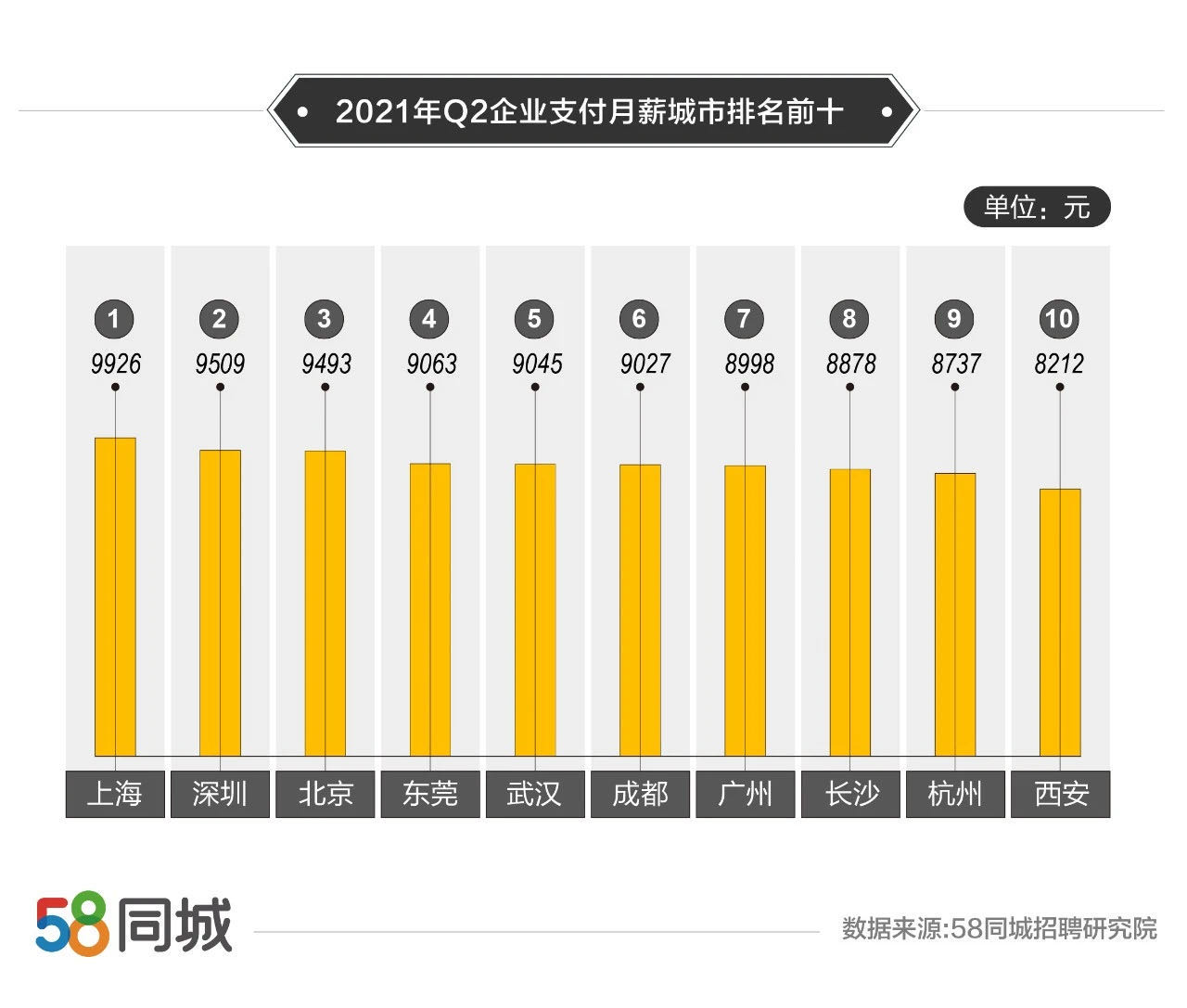 从薪资上看,2021年二季度,全国整体平均支付薪资有一定涨幅,同比上升11.16%,达到8276元。其中,上海企业支付薪资依然稳居第一,平均支付月薪9926元,深圳、杭州次之,支付月薪分别达到9509、9493元。另外,东莞、武汉和成都的平均支付月薪也在9000元以上,高于广州。
