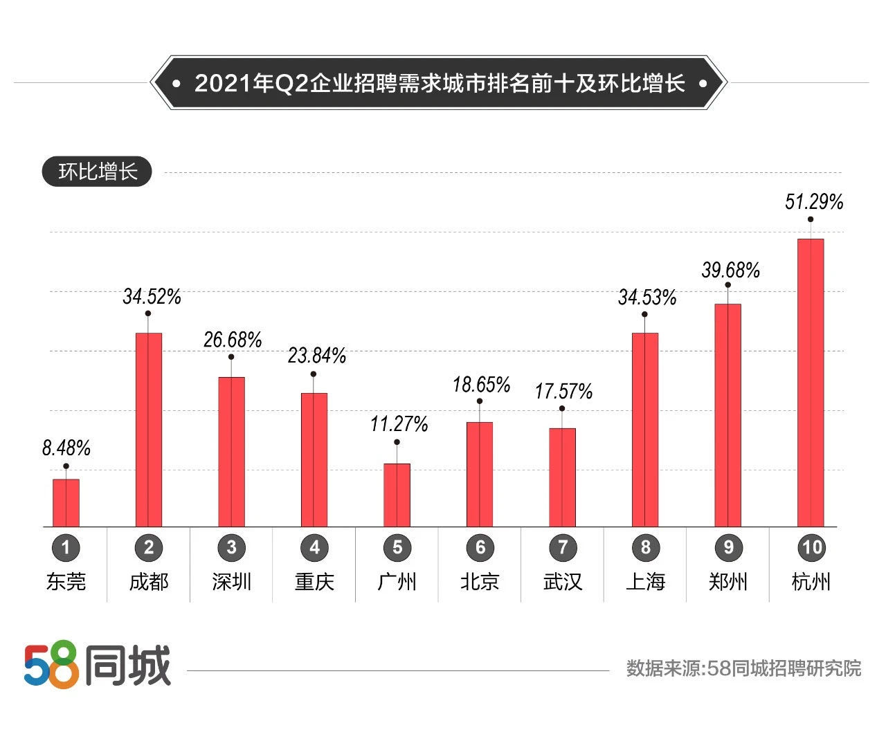 具体到城市,东莞、成都、深圳、重庆、广州、北京、武汉、上海、郑州、杭州招聘活跃度位列前十。其中,杭州招聘需求环比增速最快,为51.29%。