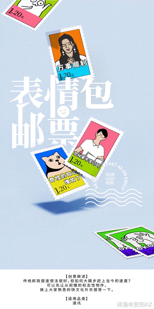 另一个创意是为通讯类品牌设计的“表情包邮票”。邮票如今已经很少出现在人们的日常通讯中了,但如果把邮票图案印上年轻人熟悉的表情包和流行语,会掀起年轻人中的邮票怀旧风吗?安知在闲鱼描述中表示,这种创意很适合传统邮政——可以先让从前慢的标志性物件,换上大家熟悉的快文化外衣感受一下。