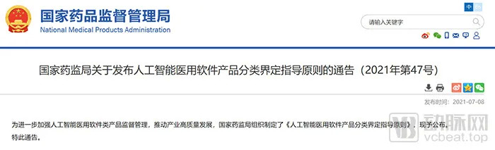 7月8日,国家药监局在官网上发布了《国家药监局关于发布人工智能医用软件产品分类界定指导原则的通告(2021年第47号)》,正式发布《人工智能医用软件产品分类界定指导原则》(下文简称《指导原则》),明确了人工智能医用软件产品的分类界定。