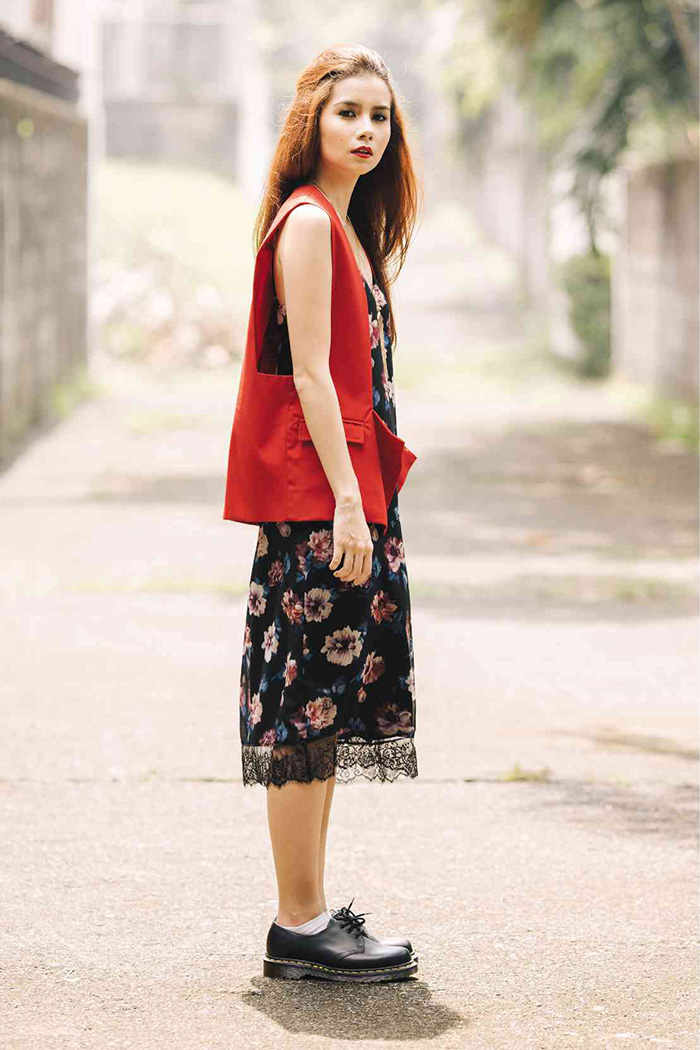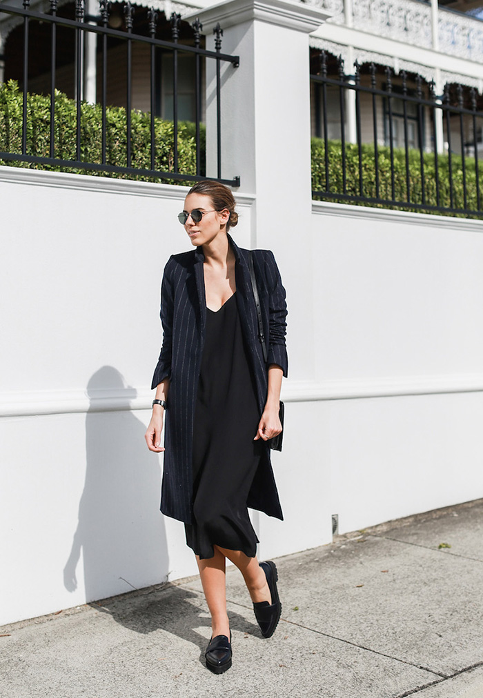 单穿吊带裙要避免沦入风尘的效果,就需要在裙子本身的剪裁和附件(鞋、手袋等)上体现了。比如以下这种露单腿加牛津鞋的搭配:
