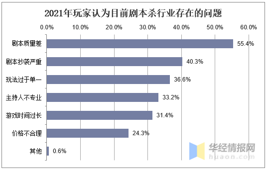 华经情报网的一份调研报告显示,50%以上的玩家认为业内剧本存在质量差的问题,40%以上的玩家认为行业内的剧本抄袭严重,这两点已经成为行业最大的问题,且都跟剧本相关。剧本杀作者白小鹿在一次采访中也讲到,越来越多的作品倡导商业化,同套路,快速的翻台率,导致很多玩家玩到的作品千篇一律。