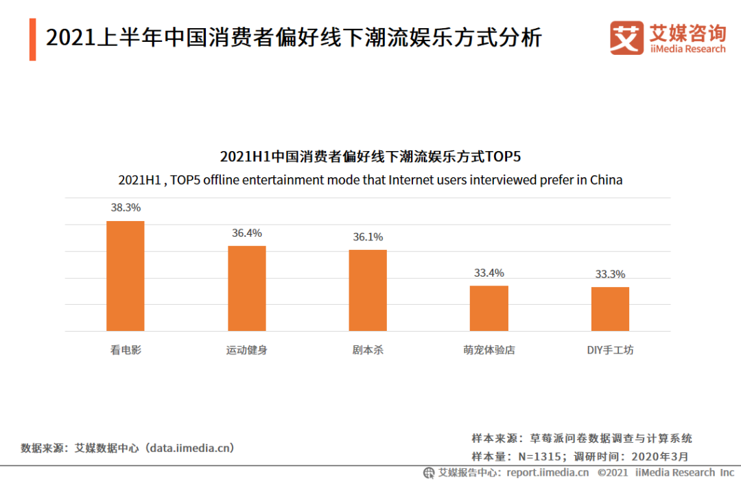 来自百度数据的统计显示,今年五一期间,与“剧本杀”消费相关的搜索量同比增长169%。另据艾媒咨询的分析数据显示,在2021上半年中国消费者偏好的线下潮流娱乐方式中,剧本杀以36.1%排名第三,仅次于看电影(38.3%)和运动健身(36.4%)。这一市场今年的规模将达 170 亿以上,2022 年将突破两百亿,未来涨势还将继续。