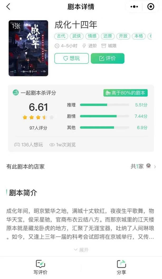 在带有点评功能的“一起剧本杀”小程序上,《唐人街探案3》、《赘婿》、《刺杀小说家》等IP改编本评分都在6分以下,被市场哄抢的《庆余年》评分甚至只有1.6分。唯一及格的是被称为口碑很好的《成化十四年》,但得到的依旧是6.61这样的低分,而这个分数却击败了平台上80%的剧本。