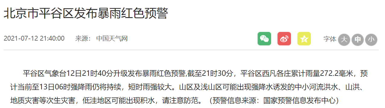 平谷区气象台12日21时40分升级发布暴雨红色预警:截至21时30分,平谷区西凡各庄累计雨量272.2毫米,预计当前至13日06时强降雨仍将持续,短时雨强较大。山区及浅山区可能出现强降水诱发的中小河流洪水、山洪、地质灾害等次生灾害,低洼地区可能出现积水。