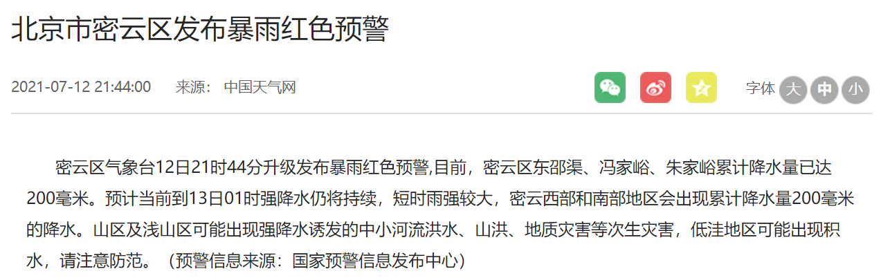 密云区气象台12日21时44分升级发布暴雨红色预警:目前,密云区东邵渠、冯家峪、朱家峪累计降水量已达200毫米。预计当前到13日01时强降水仍将持续,短时雨强较大,密云西部和南部地区会出现累计降水量200毫米的降水。山区及浅山区可能出现强降水诱发的中小河流洪水、山洪、地质灾害等次生灾害,低洼地区可能出现积水。