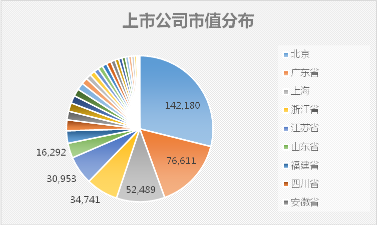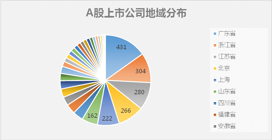全部2843家上市公司,集中分布在广东、浙江、江苏、北京、上海以及山东6个省市级区域,合计1665家,占比58.56%。事实上,这6个省级区域也是中国经济最发达的地区,GDP总额位居全国前列。