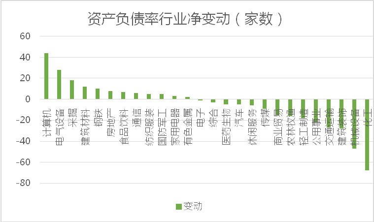 不过,资产负债率的变动在不同行业呈现不同的趋势。剔除金融企业以后,剩余2788家上市公司中,资产负债率上升的共计1329家,占比48%。