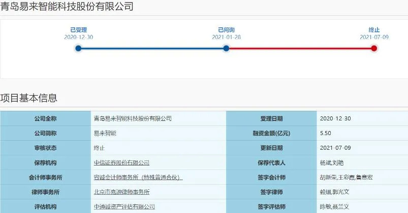 7月7日,青岛易来智能科技股份有限公司(以下简称“易来智能”)和保荐人中信证券股份有限公司(以下简称“中信证券”)申请撤回申请文件,7月9日易来智能IPO终止审核。
