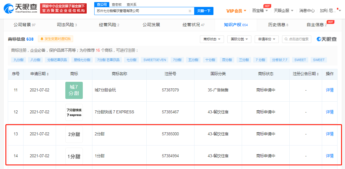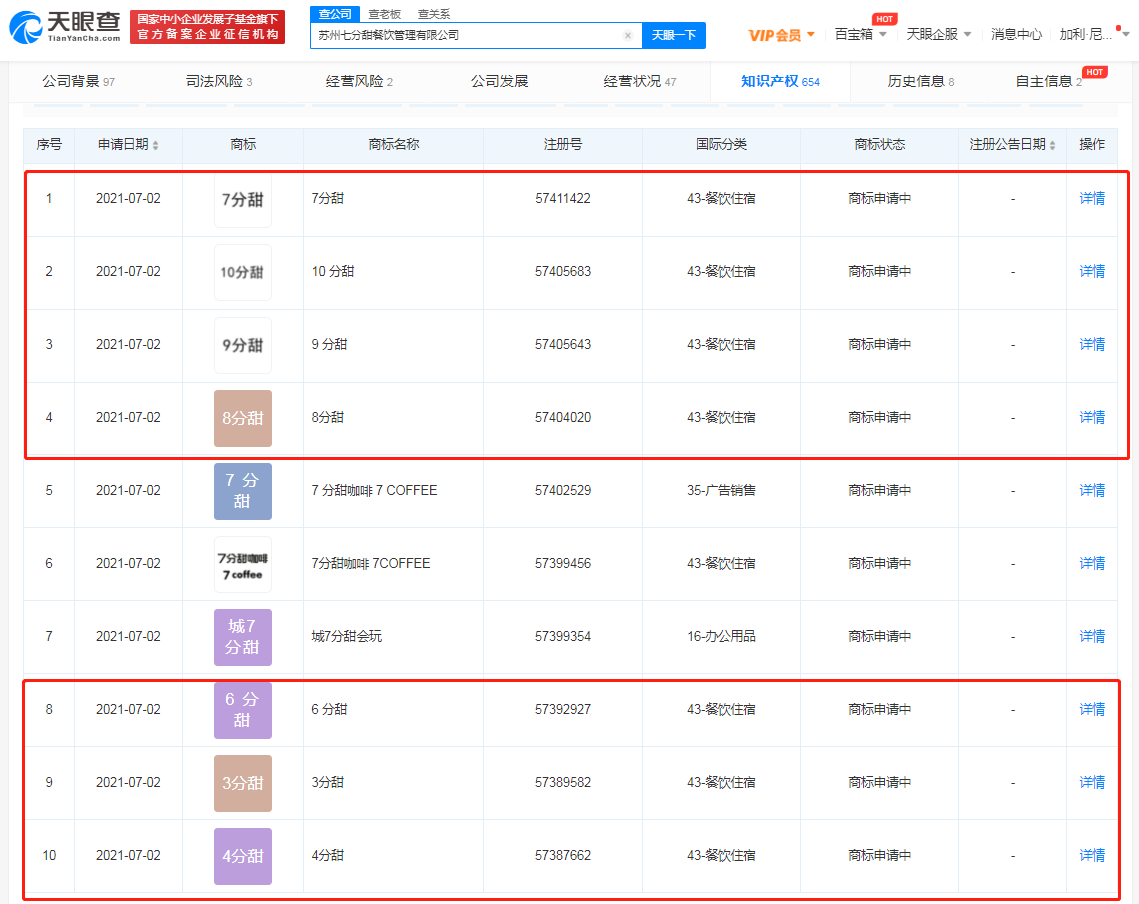 7分甜商标注册至“10分甜”