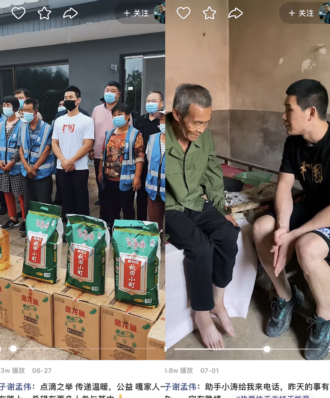 6月30日,谢孟伟在快手上传了一段自己见义勇为的视频:和助理一起开车经过农田时,救下一位晕倒的大爷,又将其护送回家。
