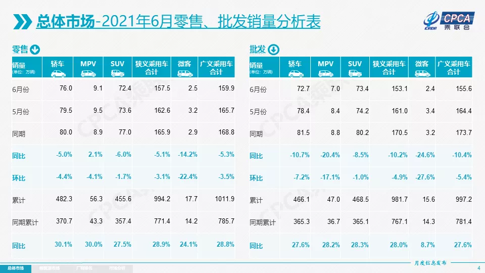 7月8日,乘联会公布了国内汽车行业6月和上半年的统计数据。上半年国内狭义乘用车市场累计零售销量(经销商实际卖出的数量)994.2万辆,同比增长28.9%,而批发量(生产商供应给经销商的数量)为981.7万辆;在中汽协的统计中,乘用车上半年产销分别为984万辆和1000.7万辆。