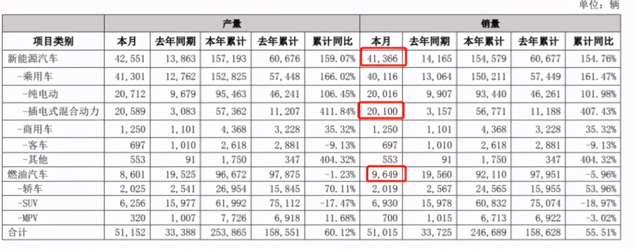 具体品牌的销售数据上也有体现,比如比亚迪:电动车销量破四万,燃油车破一万——前者突破,后者跌破,冰火两重天。