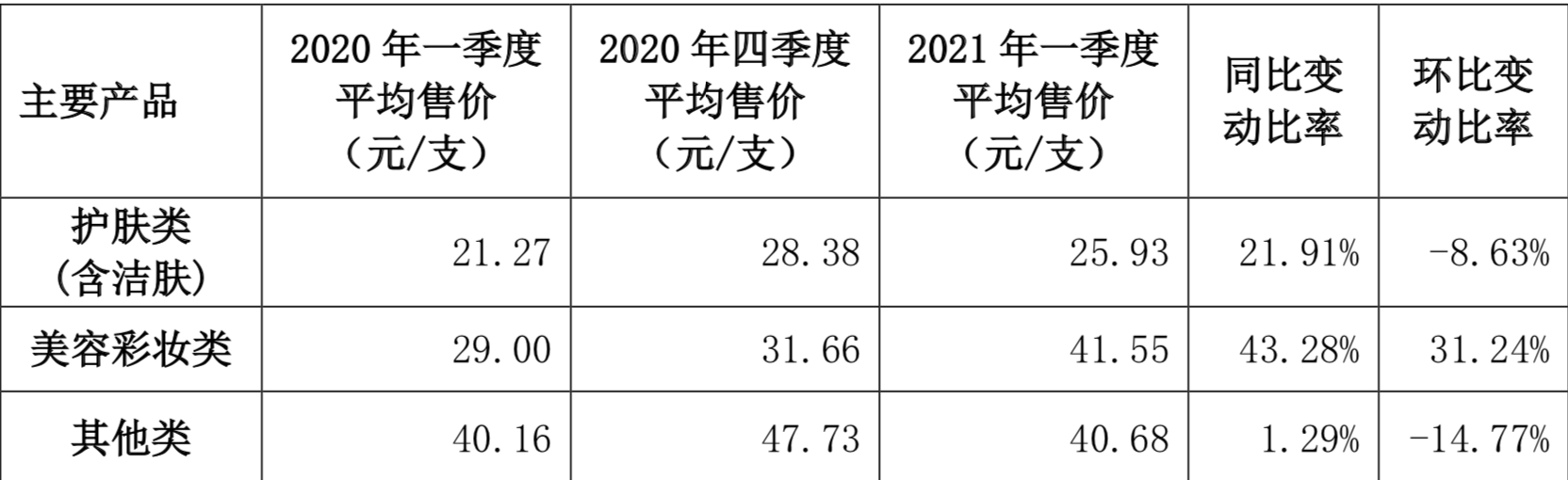 珀莱雅表示,活性物是公司主要原材料之一,2021 年第一季度平均采购单价较2020年第一季度上涨30.88%;油酯蜡在2021 年第一季度平均采购单价较2020 年第一季度上涨11.13%。
