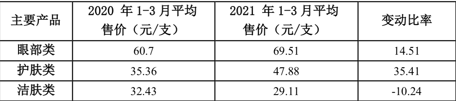 具体来看,珀莱雅的护肤类主要产品平均售价同比提高21.91%;丸美的护肤类主要产品平均售价同比提高35.41%,眼部类主要产品售价同比提高14.51%;上海家化的护肤类主要产品平均售价同比提高15.97%。