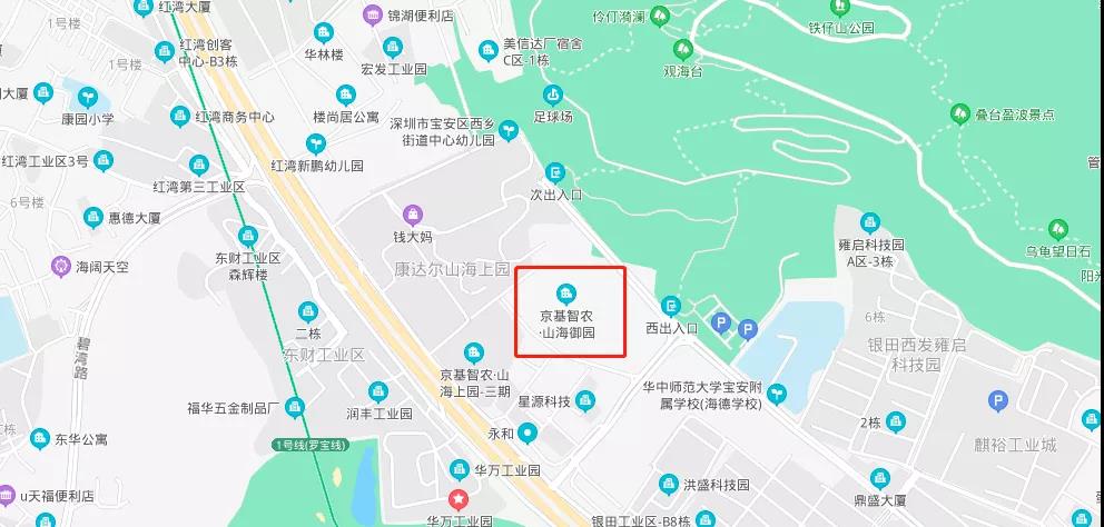 京基智农山海御园位于宝安大道和铁仔山公园旁,在通达路与共和工业路的交汇处,在太空港片区和前海合作区之间,周边还有碧海湾公园,生态资源优越。