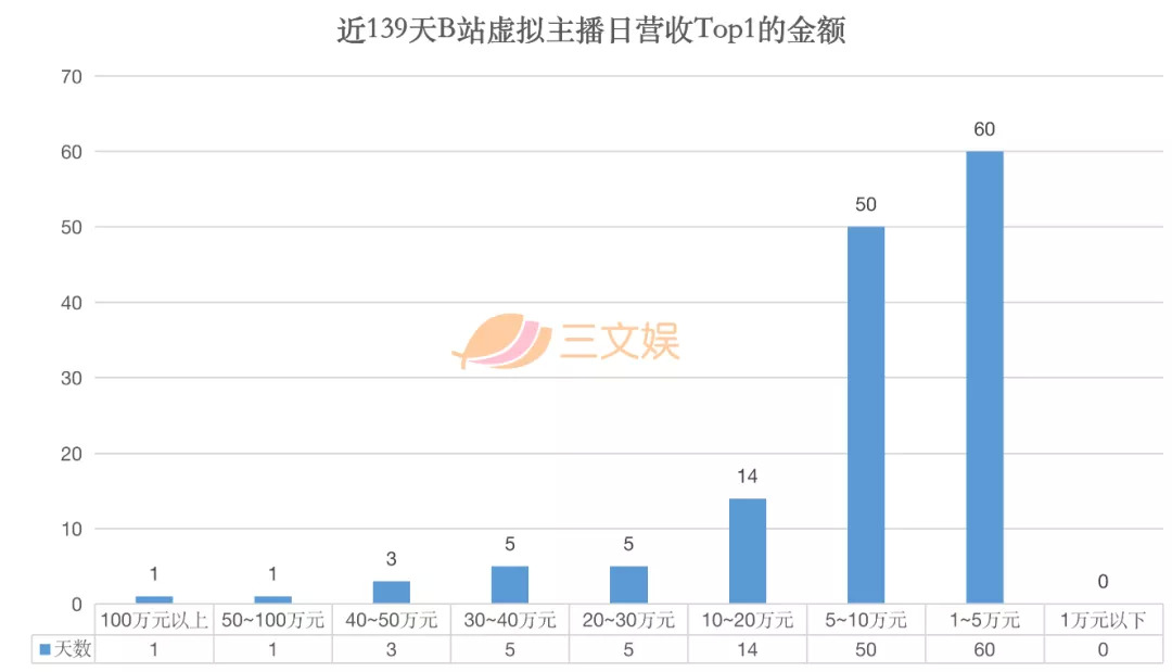 虽然在这个虚拟主播直播日营收Top1的统计中,有近一半儿时间未达5万元。但这并不能完全表示,日收入过万的虚拟主播中,收入区间在1~5万元的主播数量就一定比5~10万元的主播多。