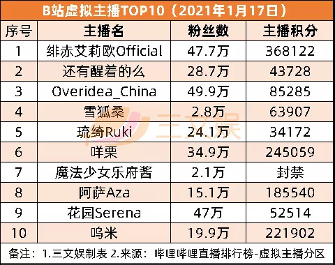 2021年1月17日,三文娱第一次在周刊的IP动态版块新增“哔哩哔哩虚拟主播直播排行榜”,以记录每周排名前十的虚拟主播主播。