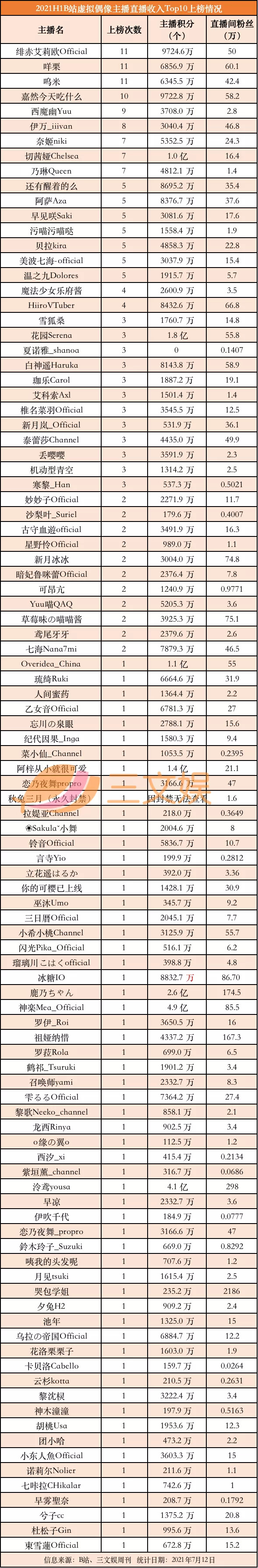B站虚拟偶像直播收入周榜,4个月有101位上榜