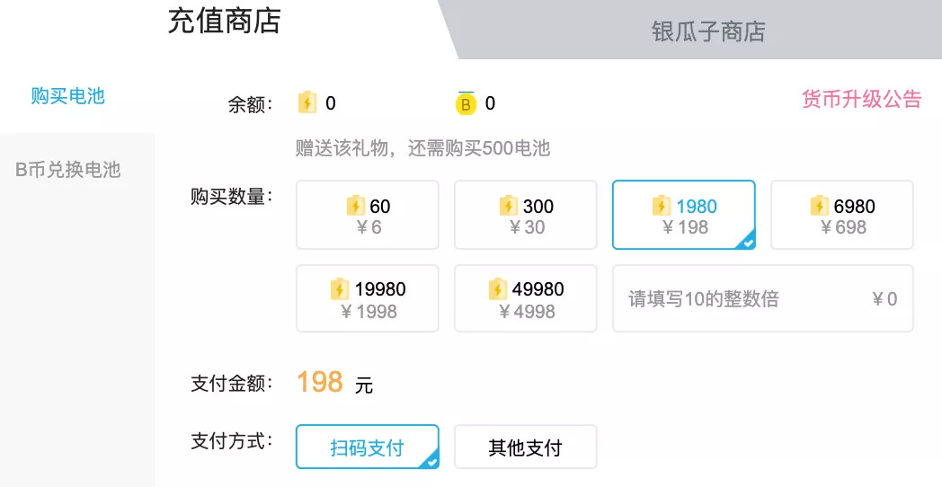 在B站,虚拟偶像的主播积分是累积的,主播每收到1电池或100银瓜子礼物就会提升1点积分。上文已有提及,1000金瓜子=1元人民币。而60电池=6元人民币,1硬币=450银瓜子。