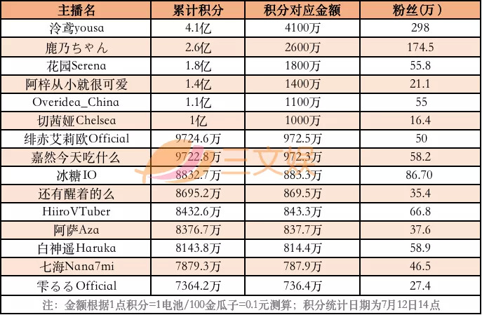 截至7月12日,这101位虚拟主播获得的积分37.76亿,对应的金额3.78亿元。