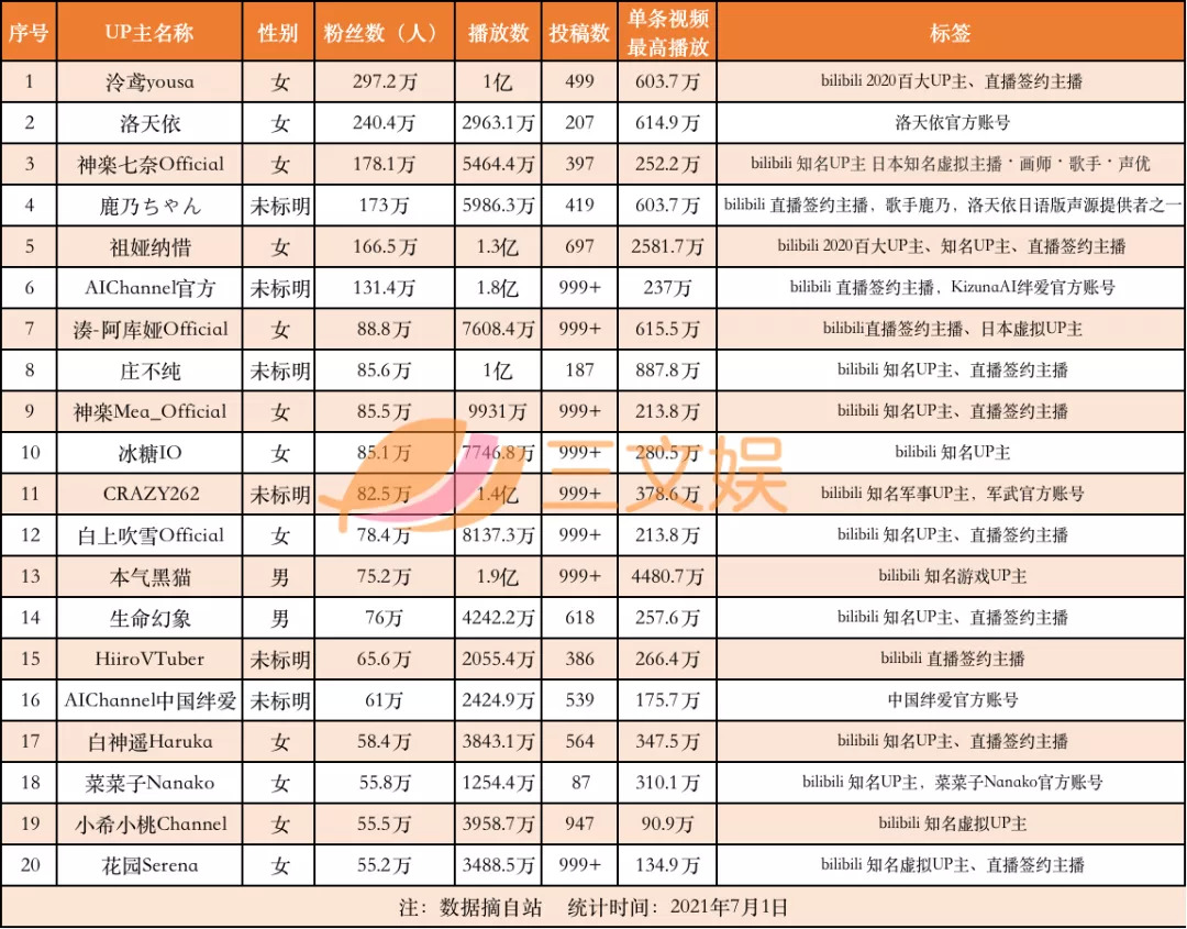 因此,三文娱对这24周上榜的虚拟偶像做了一个统计: