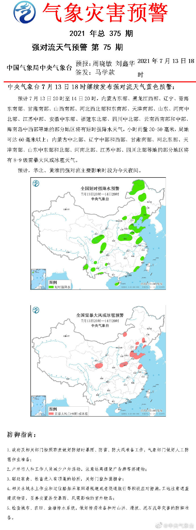 @中央气象台 微博消息,中央气象台7月13日18时继续发布强对流天气蓝色预警:预计7月13日20时至14日20时,内蒙古东部、黑龙江西部、辽宁、青海东南部、甘肃南部、山西南部、河北西北部和东南部、天津南部、山东、河南中北部、江苏中部、安徽中东部、福建东北部、四川中北部、云南西南部和中部、海南岛中西部等地的部分地区将有短时强降水天气,小时雨量30-50毫米,局地可达60毫米以上;内蒙古中北部、辽宁中部和西部、甘肃南部、河北东部、天津南部、山东中东部和北部、河南北部、江苏中部、四川北部等地的部分地区将有8-9级雷暴大风或冰雹天气。