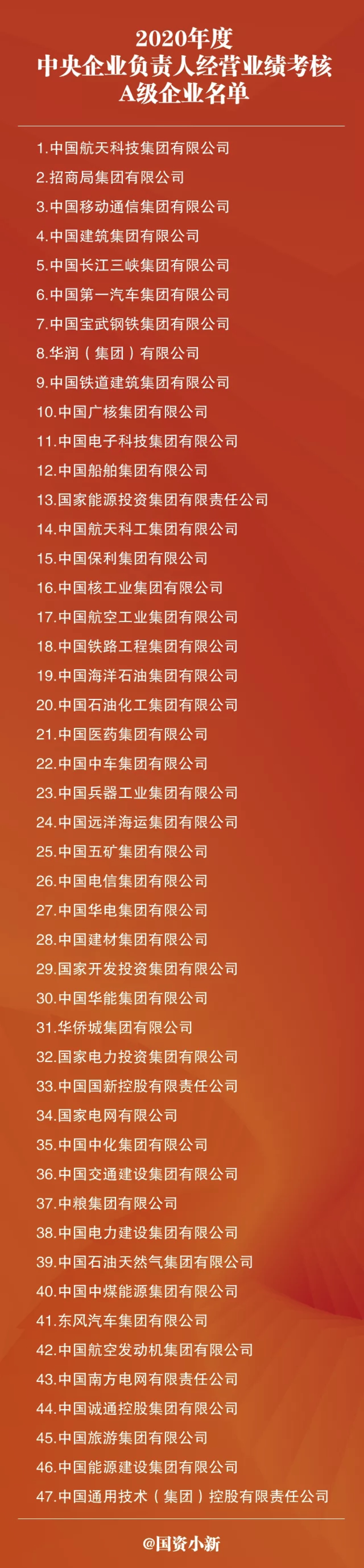 “国资小新”微信公众号7月13日消息,根据《中央企业负责人经营业绩考核办法》,2020年度中央企业负责人经营业绩考核结果已经国资委党委会议审议通过。2020年度央企负责人经营业绩考核A级企业名单正式公布,包含中国航天科技集团、招商局集团、中国移动通信集团等47家央企。