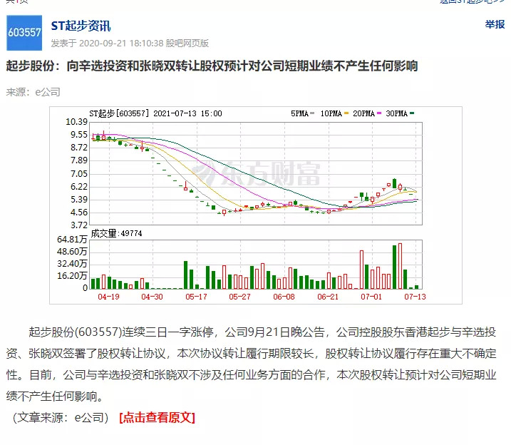 7月8日,ST起步发布公告称,广州辛选通过集中竞价的方式,减持ST起步公司部分477.09万股,占到了公司总股本的0.96%,而减持价格在6.16元/股-6.74元/股。