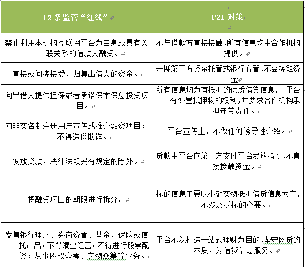 P2I,全称Person-to-information(information service),即个人对有质/抵押的借贷信息服务平台,不仅契合了P2P的原来本质,而且弥补了由于中国特殊国情所造成的发展局限性,赋予了传统网贷平台所欠缺的真实、透明和安全的金融属性。从其业务模式上来看,P2I能够在不触碰监管“红线”的基础上,从源头规避风险: