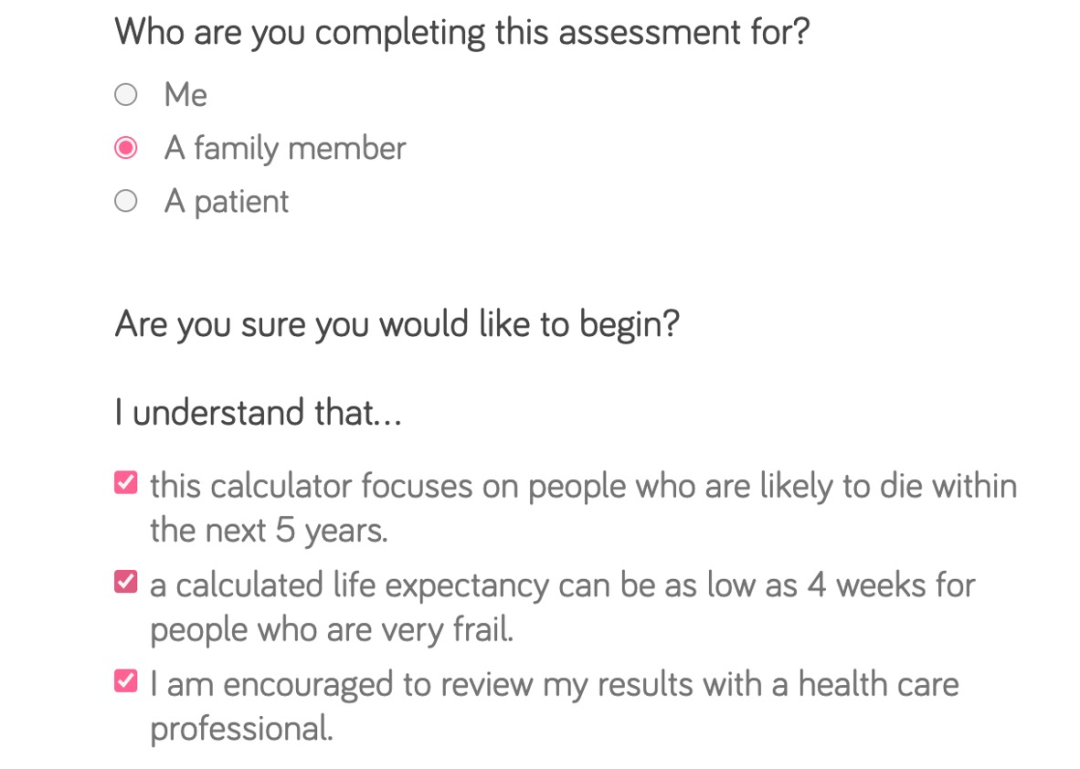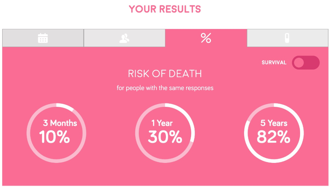 在你回答第一部分问题后,右侧就会出现一个寿命预测栏,显示出给出同样回答的老人一般剩余寿命是多少,数字会根据你给出的答案在几周到5年之间变动,并将患者的死亡风险分为低、中、高或非常高。