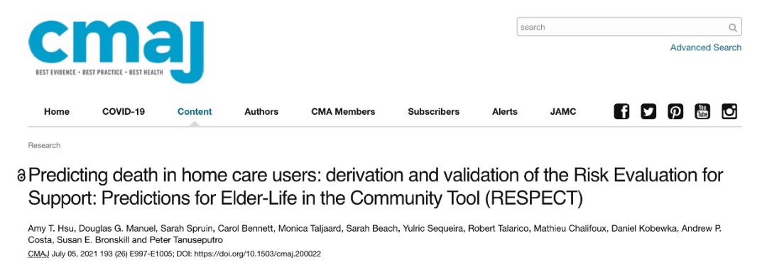 “RESPECT”的全称为Risk Evaluation for Support: Predictions for Elder-life in the Community Tool(支持风险评估:社区老年人生命预测工具)。该工具基于安大略省的家庭护理数据开发和验证,研究员们使用了超过130万份家庭护理评估的数据,并在2007年-2014年7年之内对8万名死亡案例进行了跟踪。