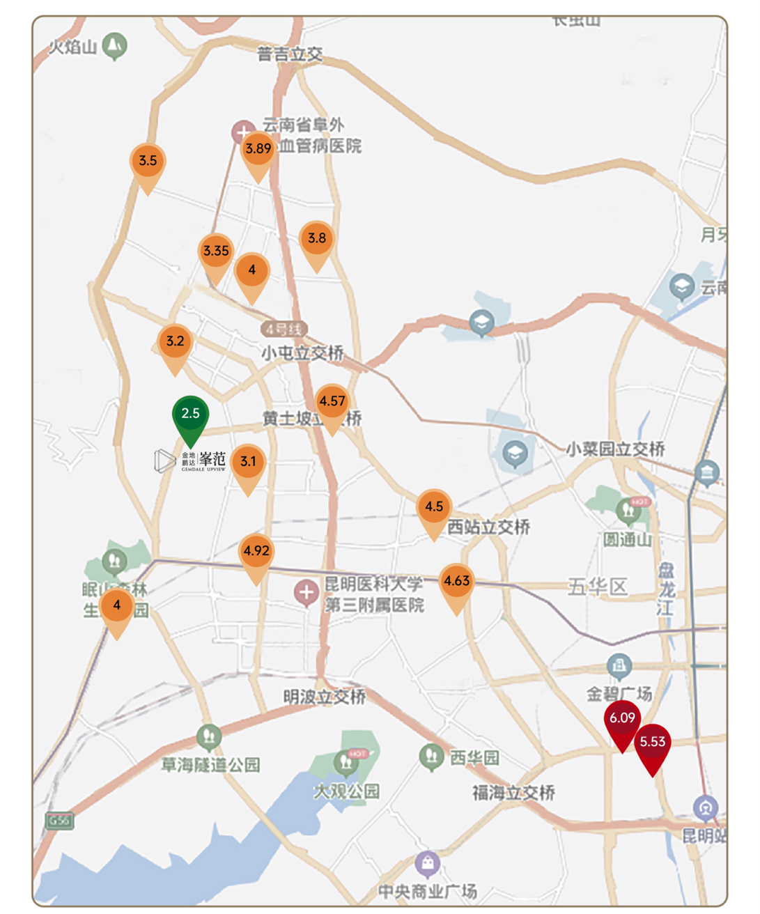 金地峯范毗邻昆明西站TOD,紧邻地铁3、4、7(规划中)号线,还有30余条公交线及众多交通主干道加持。西城时代、奥特莱斯、吾悦广场等众多大型商圈环伺,云师大附中、昆明一中、西山一中等优质教育资源环绕,距离昆明医科大学第一附属医院、云南省阜外心血管医院等不远……区位、交通、医疗、教育等优势显而易见。