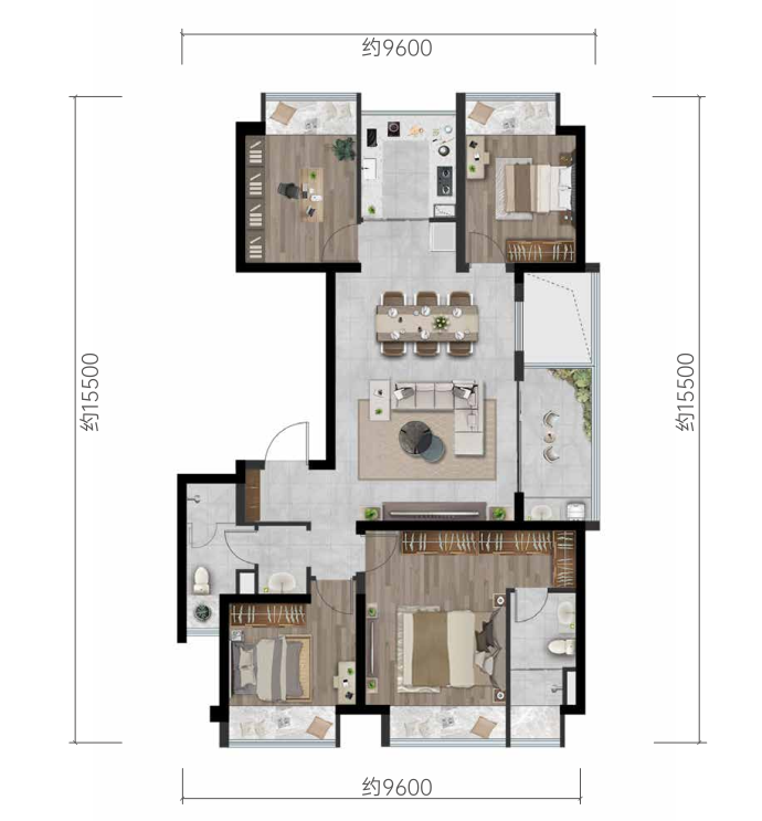 再来看看建面约135㎡的C1户型就知道其优越性,同为四室两厅两卫设计,均做到了南北通透,三面采光。四个卧室分居四角,避免老人、孩子和加班时不同作息时间带来的干扰。南向约21㎡套房式主卧,步入式衣帽间、独立卫浴、阔景飘窗齐备,进一步提升生活舒适感。另外3个房间同样尺度感十足,不必“屈尊”做书房、儿童房、影音室,而是“实打实”地作为卧室使用。