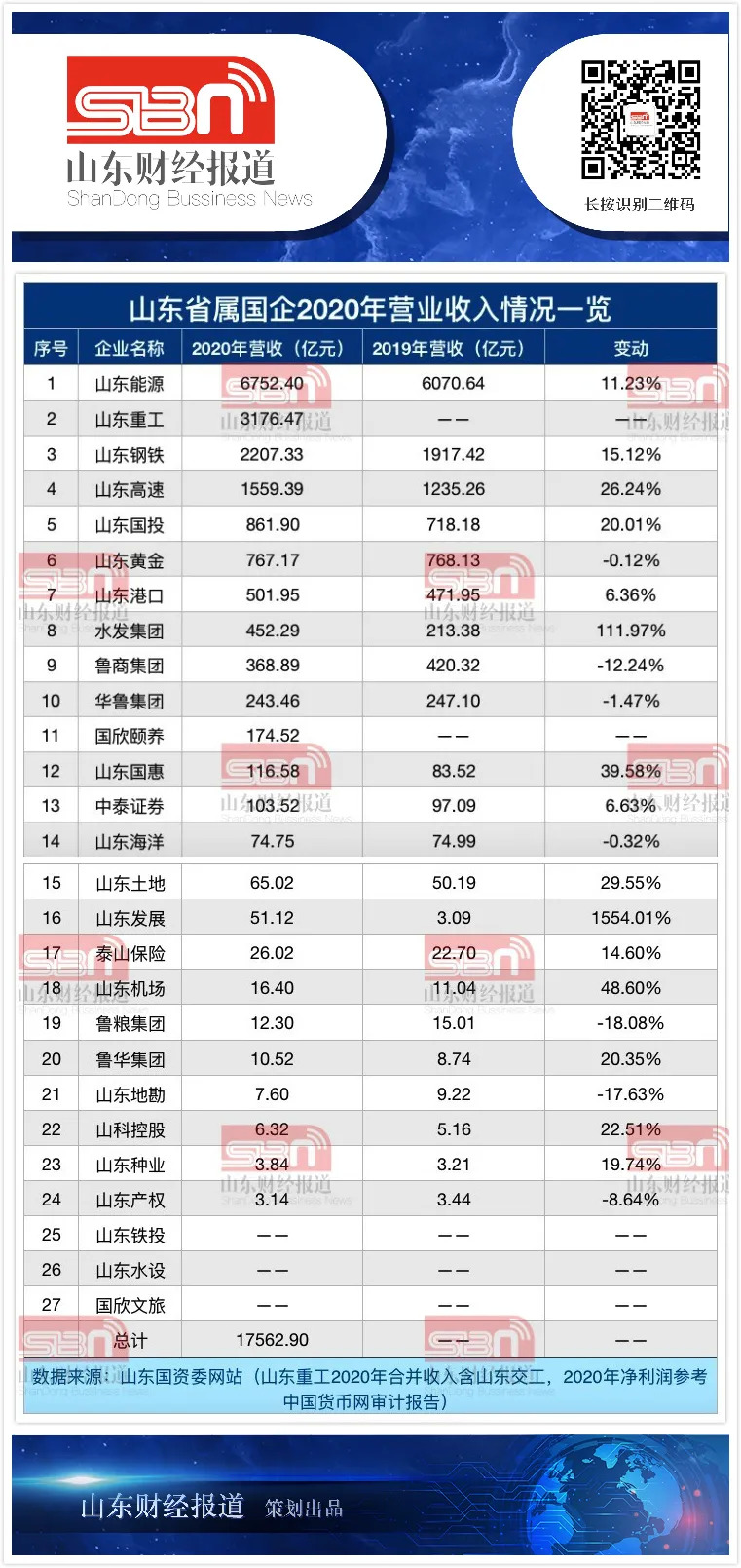 从营业收入来看,已披露该指标的24家企业(含山东土地)2020年全年实现营业收入总计17562.9亿元。山东财经报道注意到,山东省属国企营业收入“千亿俱乐部”的4个席位未变,因合并重组的缘故,营收规模超千亿元的企业名单焕然一新且纷纷实现进阶。