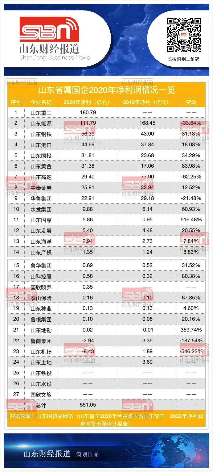 山东财经报道统计显示,23家已披露年报数据的省属国企2020年合计净利润达551.05亿元,21家企业实现盈利。