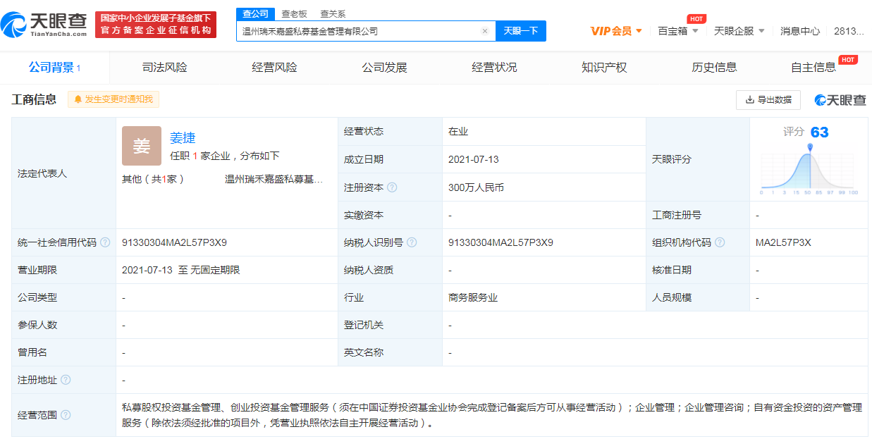 据天眼查APP显示,7月13日,温州瑞禾嘉盛私募基金管理有限公司成立,注册资本300万人民币,法定代表人为姜捷,经营范围含私募股权投资基金管理、创业投资基金管理服务等。股东信息显示,森马集团有限公司持有该公司60%的股份,为第一大股东。