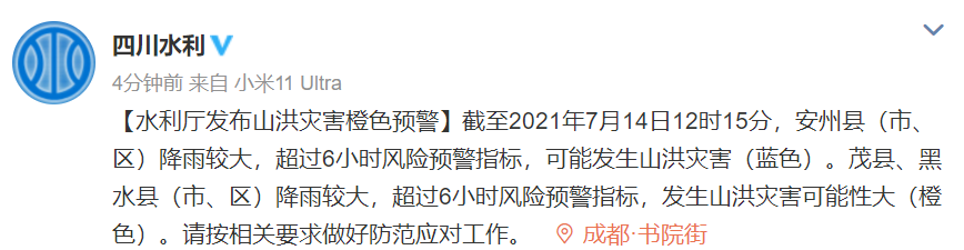 据@四川水利 微博消息,四川省水利厅发布山洪灾害橙色预警:截至2021年7月14日12时15分,安州县(市、区)降雨较大,超过6小时风险预警指标,可能发生山洪灾害(蓝色)。茂县、黑水县(市、区)降雨较大,超过6小时风险预警指标,发生山洪灾害可能性大(橙色)。