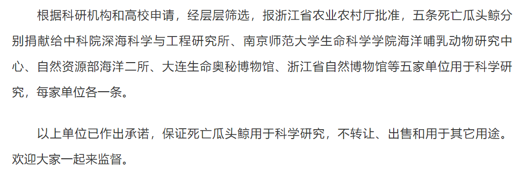 以上单位已作出承诺,保证死亡瓜头鲸用于科学研究,不转让、出售和用于其它用途。