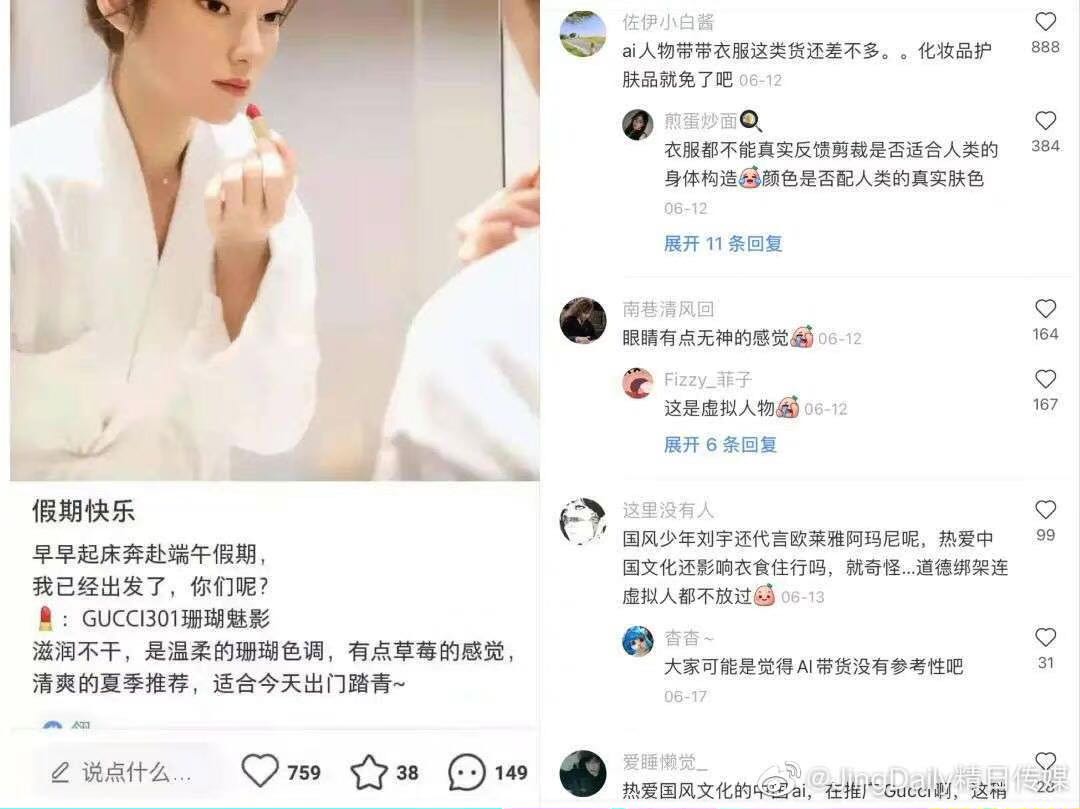 这或与评论区下倾倒性的负面评价相关,不少网友质疑其带货美妆的能力。其中,首条网友评论就表示,虚拟人物进行服饰带货尚可,但宣传化妆品会产生违和感。