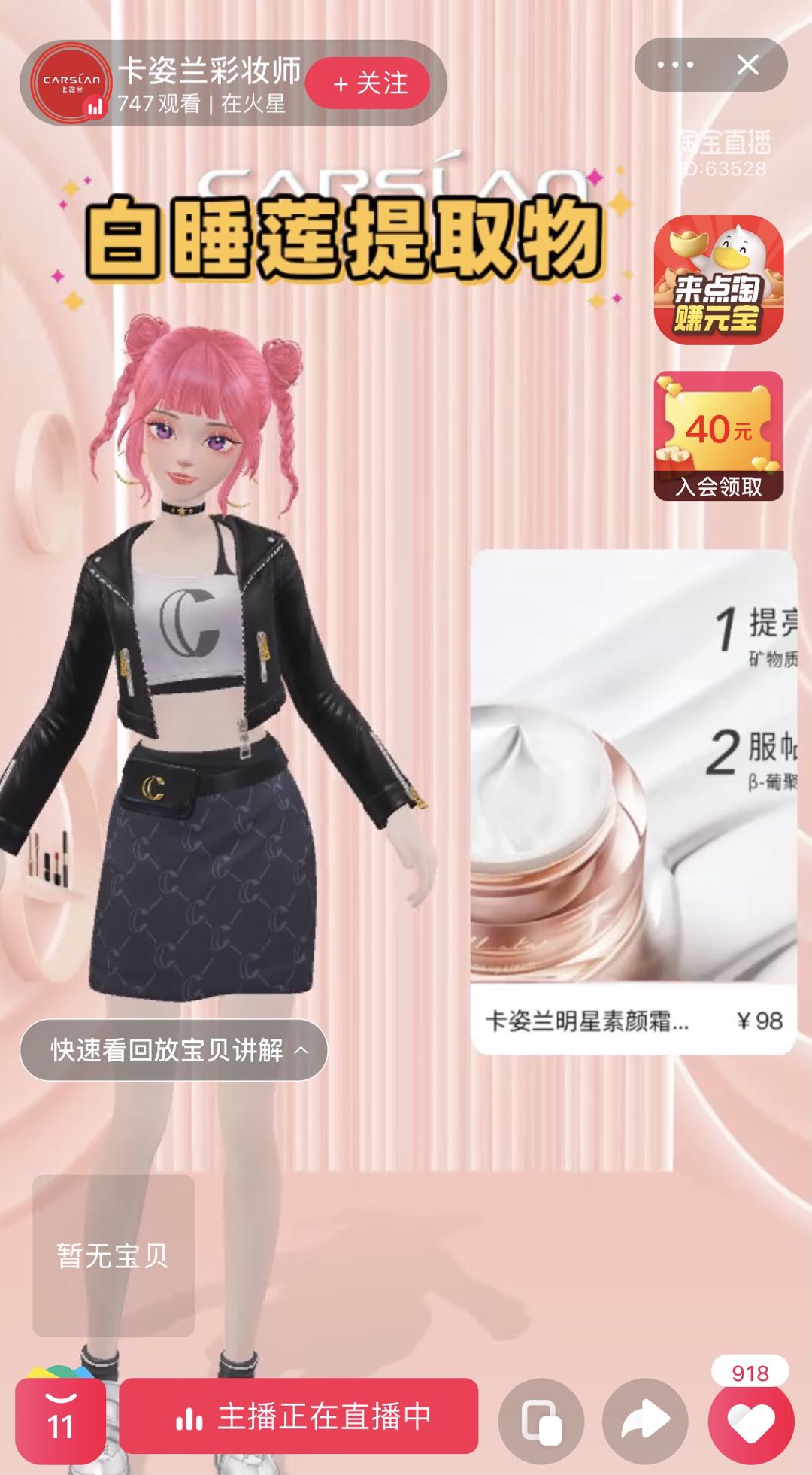 品牌虚拟形象的作用还不止于静态的二维平面。卡姿兰的虚拟偶像大眼卡卡现在就成为了该品牌直播间的日常主播之一。但出于技术上的局限性,大眼卡卡在进行产品介绍时无法试妆,只能通过讲解和图片来展示产品效果,直播中与观众的互动性也大打折扣。