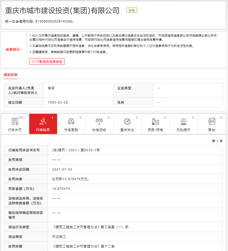 因无证施工,重庆市城市建设投资(集团)有限公司(以下简称“重庆城投集团”)被罚款10.870479万元。