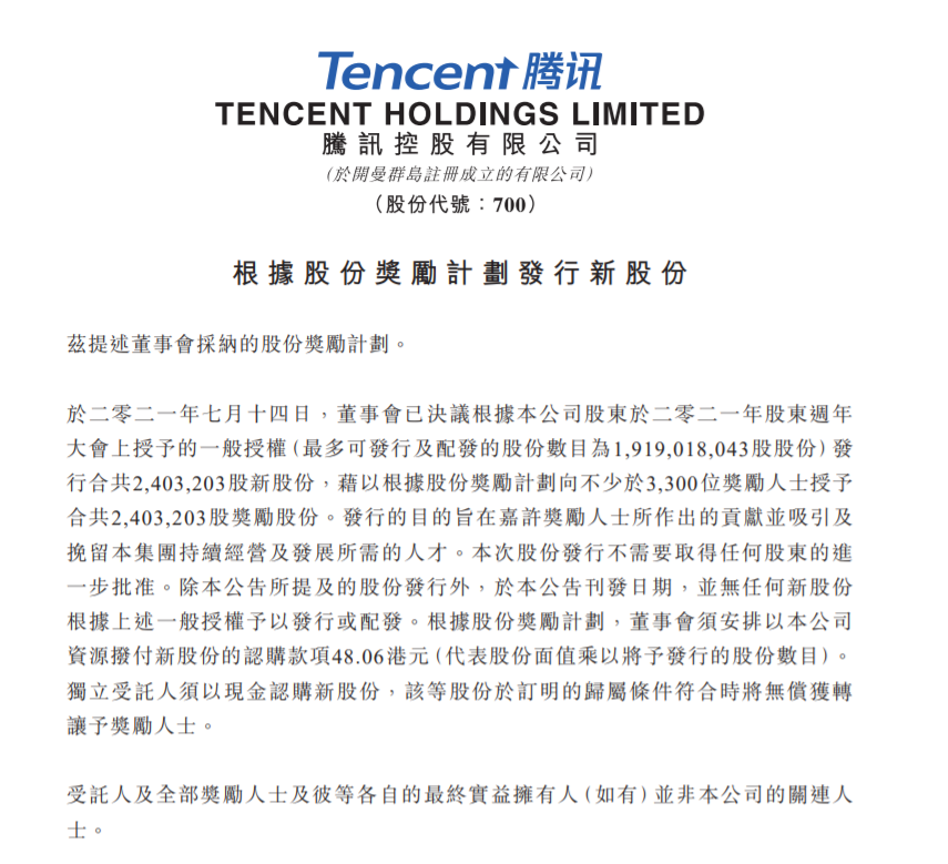 7月14日晚,腾讯控股在港交所公告,根据股份奖励计划,拟向不少于3300位奖励人士授予合共2,403,203股奖励股份。董事会须安排以本公司资源拨付新股份的认购款项48.06港元。